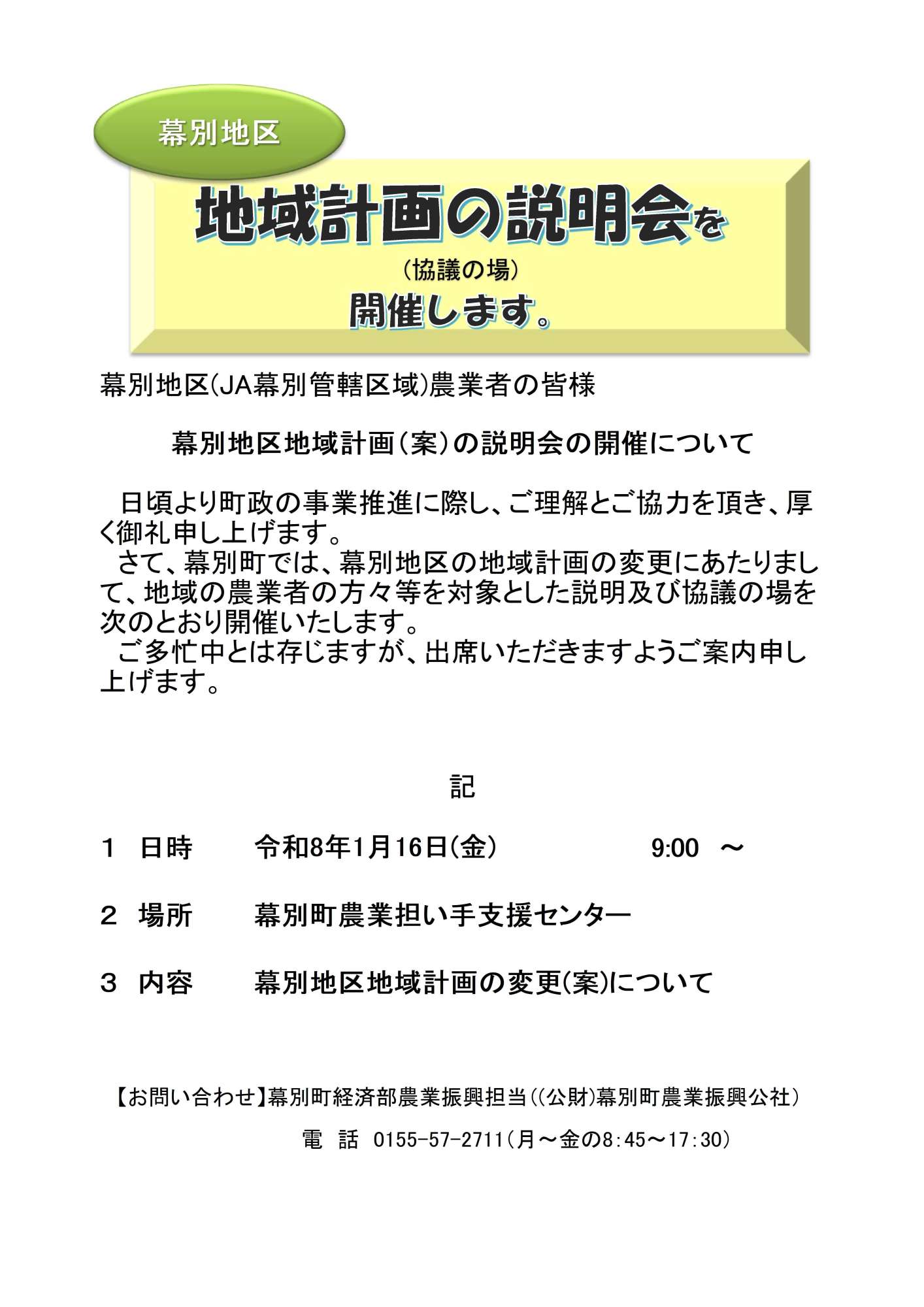 幕別地区地域計画の変更にあたり、地域の農業者の方々等を対象とした説明会・協議の場を開催いたします。