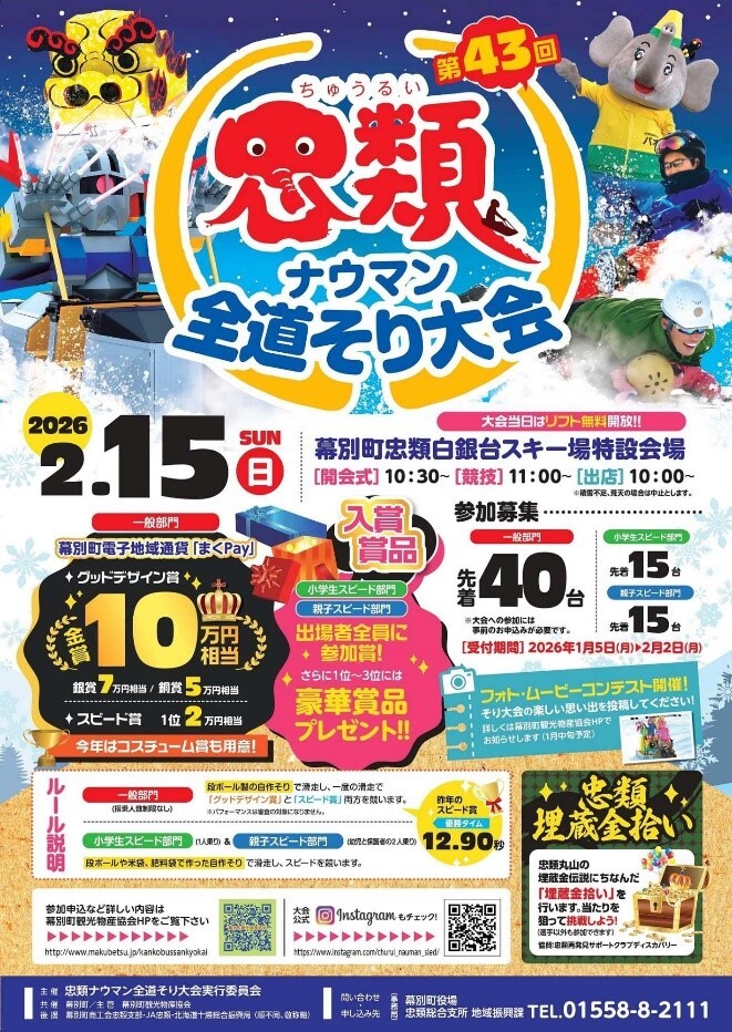 『第43回忠類ナウマン全道そり大会』で火災予防啓発活動を行います! ページID:900860更新日2026年1月22日 印刷プレビュー 2月15日(日曜日)に開催する『第43回忠類ナウマン全道そり大会』にあわせ、幕別町忠類白銀台スキー場特設会場にて住宅用火災警報器とリチウムイオン電池火災の予防啓発活動を実施します。消太くんも活動に参加し、写真撮影も可能ですのでぜひお立ち寄りください! 時間:10時00分~正午 住宅用火災警報器は正しく設置し点検しましょう! ※大会が中止になった場合、火災予防啓発活動は中止します。